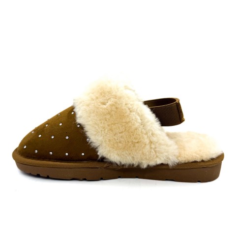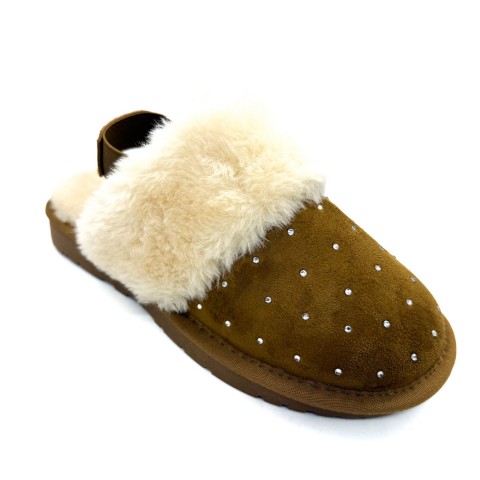 Ciabatta con pelliccia ecologica ed elastico alla caviglia. Strass sulla tomaia e fondo in gomma antiscivolo.
