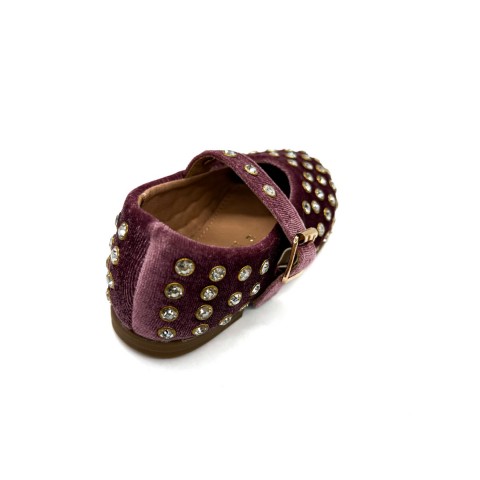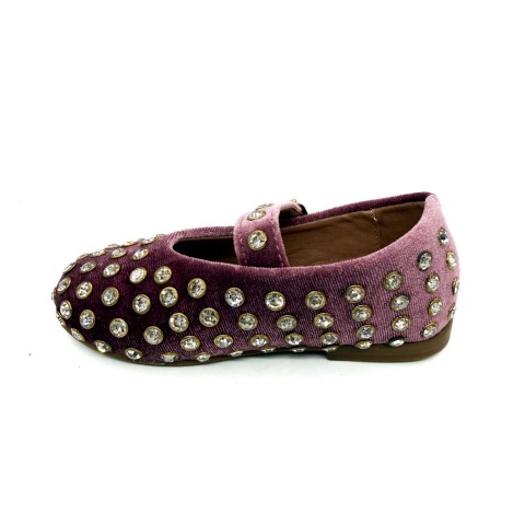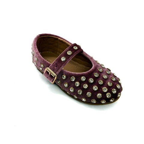 Ballerina in velluto rosa antico con strass e cinturino regolabile. Fondo in gomma e sottopiede in pelle