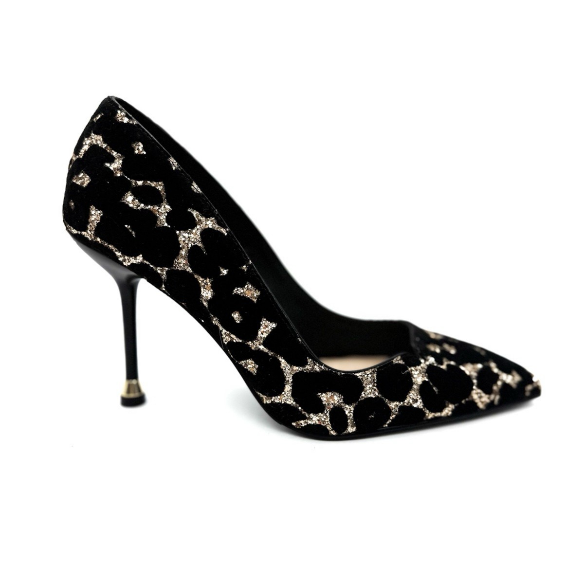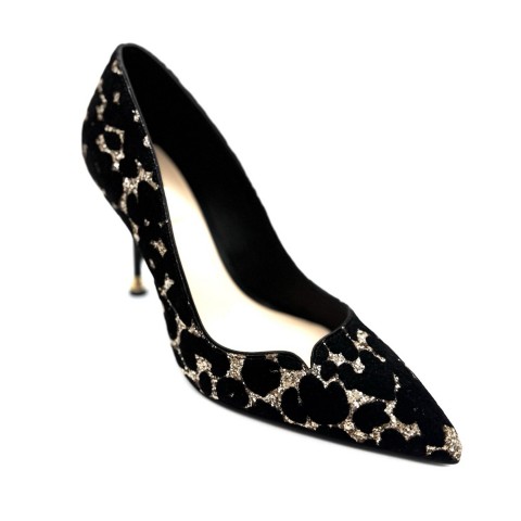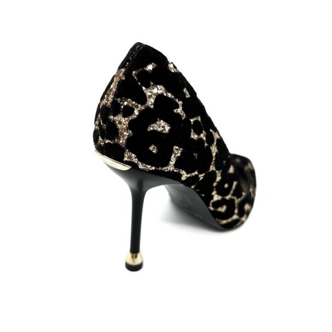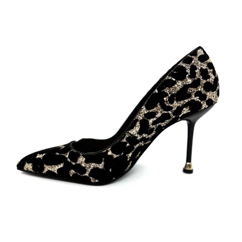 Décolleté nera con glitter oro stampa animalier con dettaglio scollo a cuore sul davnti e punta affusolata. Tacco a spillo di 9,5 cm.