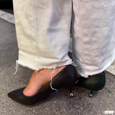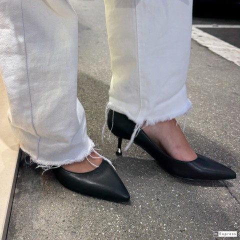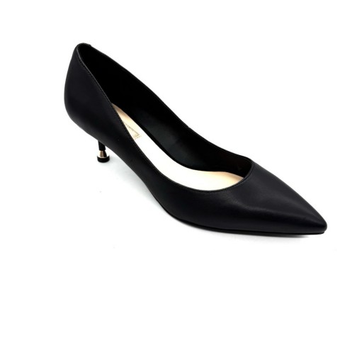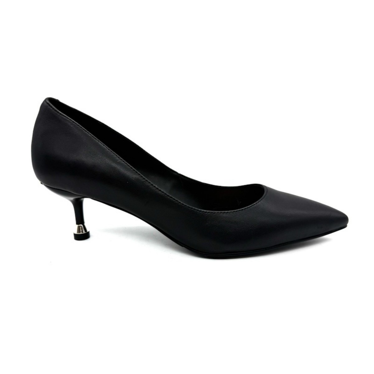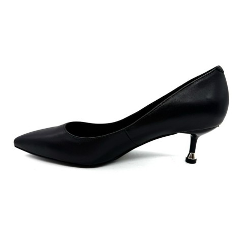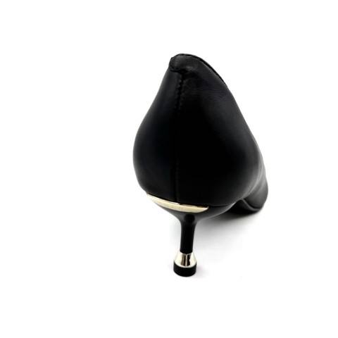Décolleté nappa nera con punta affusolata e tacco basso a spillo di 5,5 cm. Accessorio logato sul dietro. Dettaglio metallizzato sul fondo che offre maggiore comfort.