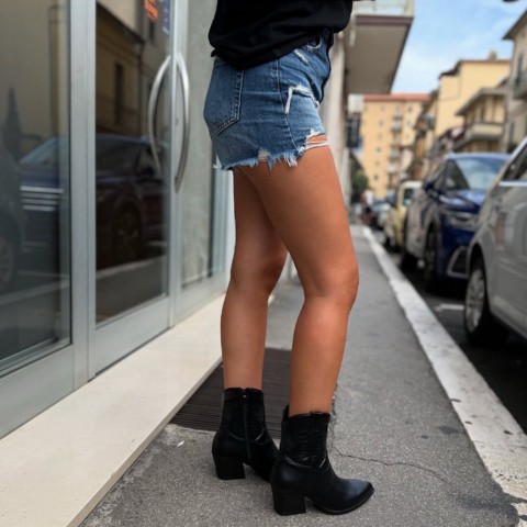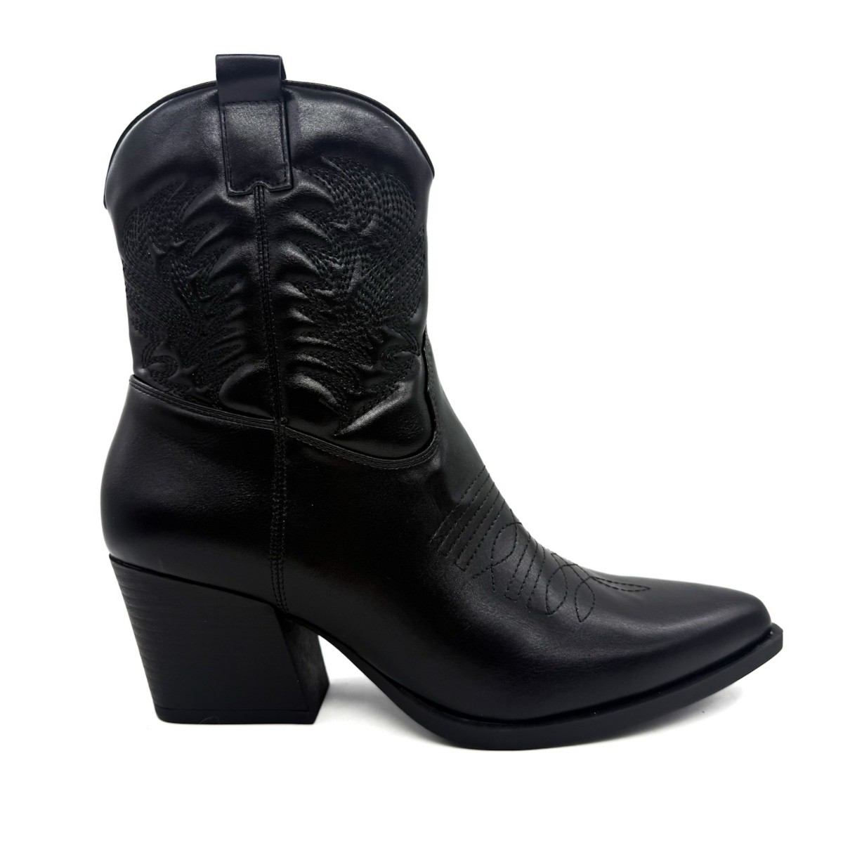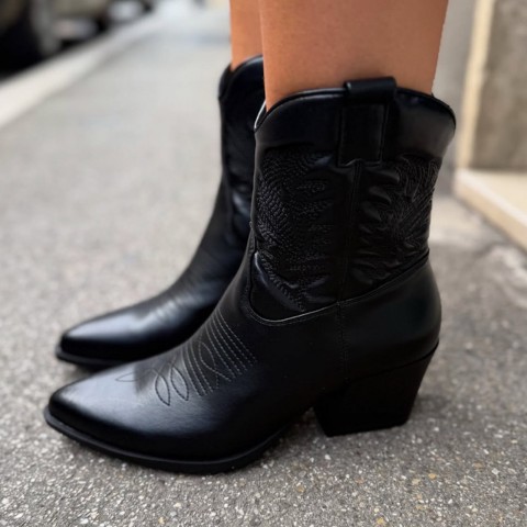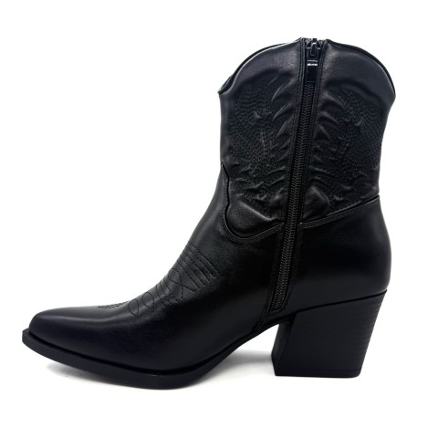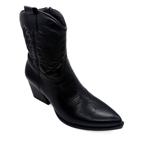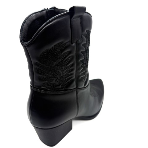 Stivaletto in ecopelle con ricami in tinta. Gambale alto 18 cm, tacco 6,5 cm. Fondo in gomma