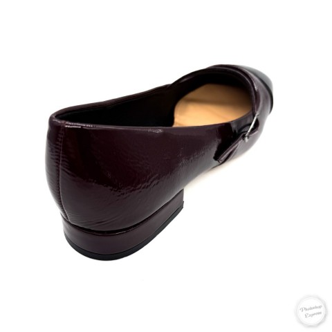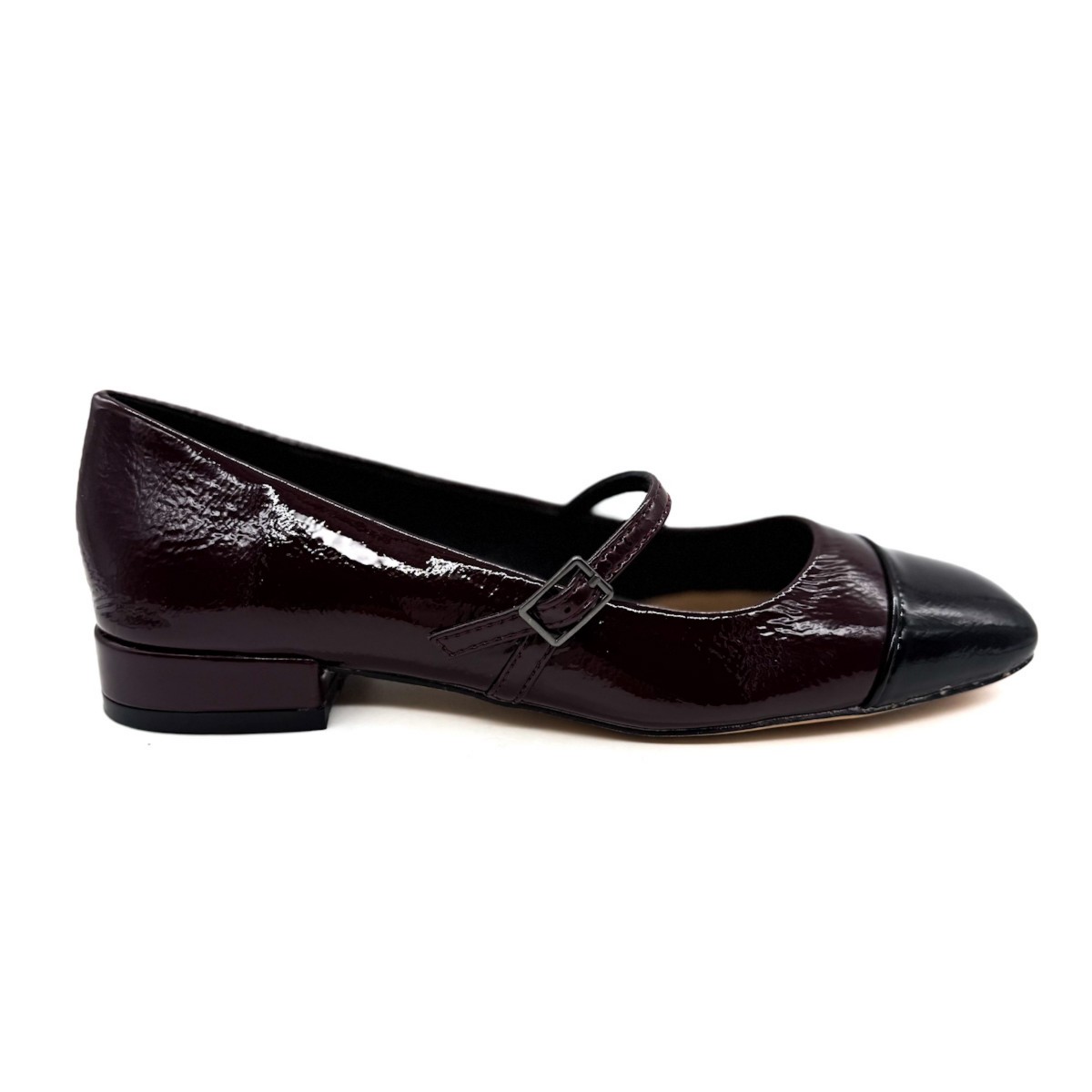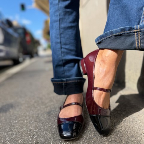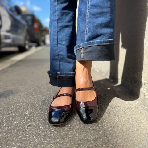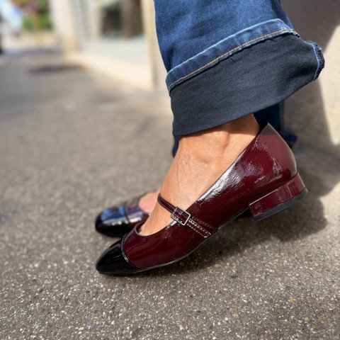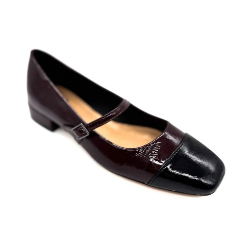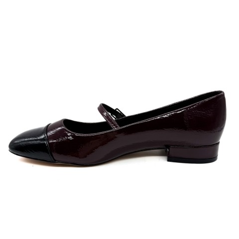 Ballerina vernice nera e bordeaux con cinturino per regolare la calzata. Sottopiede in vera pelle