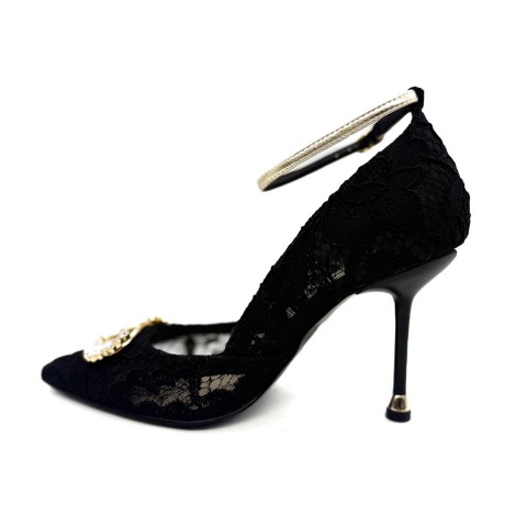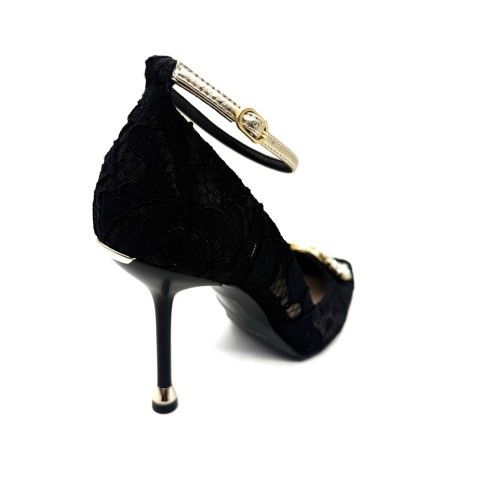 Décolleté in pizzo con logo gioiello e punta affusolata. Chiusura con cinturino laminato oro alla caviglia, tacco a spillo alto 9,5 cm e dettaglio metallizzato sul fondo. Accessorio logato sul tacco