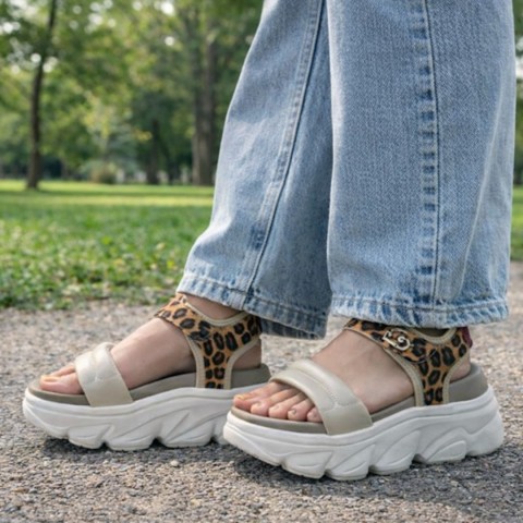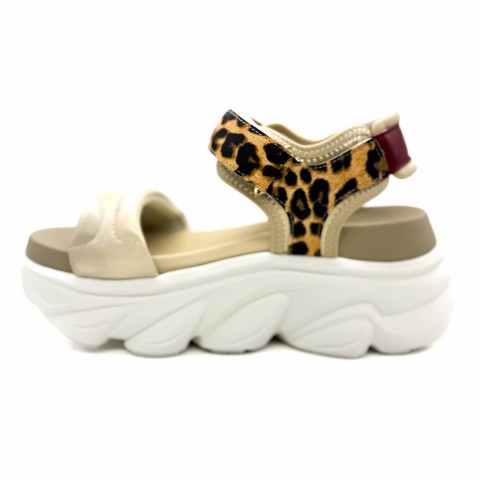 Sandalo con fascetta bold ed inserti con stampa animalier e chiusura con velcro. Altezza suola 6 cm