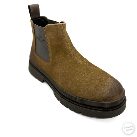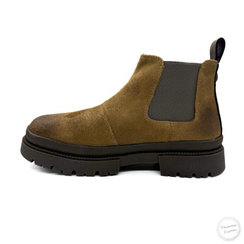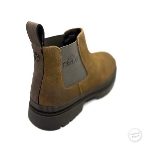 Stivaletto con tomaia realizzata in suede idrorepellente, dotato di bande elastiche laterali e linguetta posteriore per facilitare la calzata. Il modello, caratterizzato da punta tonda e suola carrarmato, è personalizzato con logo d'archivio e lettering Replay applicati a lato.